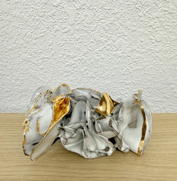 This piece measures 4in x 3in x 1.5 and is composed of very thin pieces of clay that is leftover when I throw a pot on the pottery wheel. This “scrap” clay is often overlooked and thrown away by artists. Instead, I recycle these then slabs by quickly removing them from my wheel and forming abstract shapes. This sculpture is comprised of 11 different scraps to form the shape. After glazing the pieces I paint 22K gold luster (the liquid version of gold) onto the piece, then fire it in the kiln to 1900 degrees.