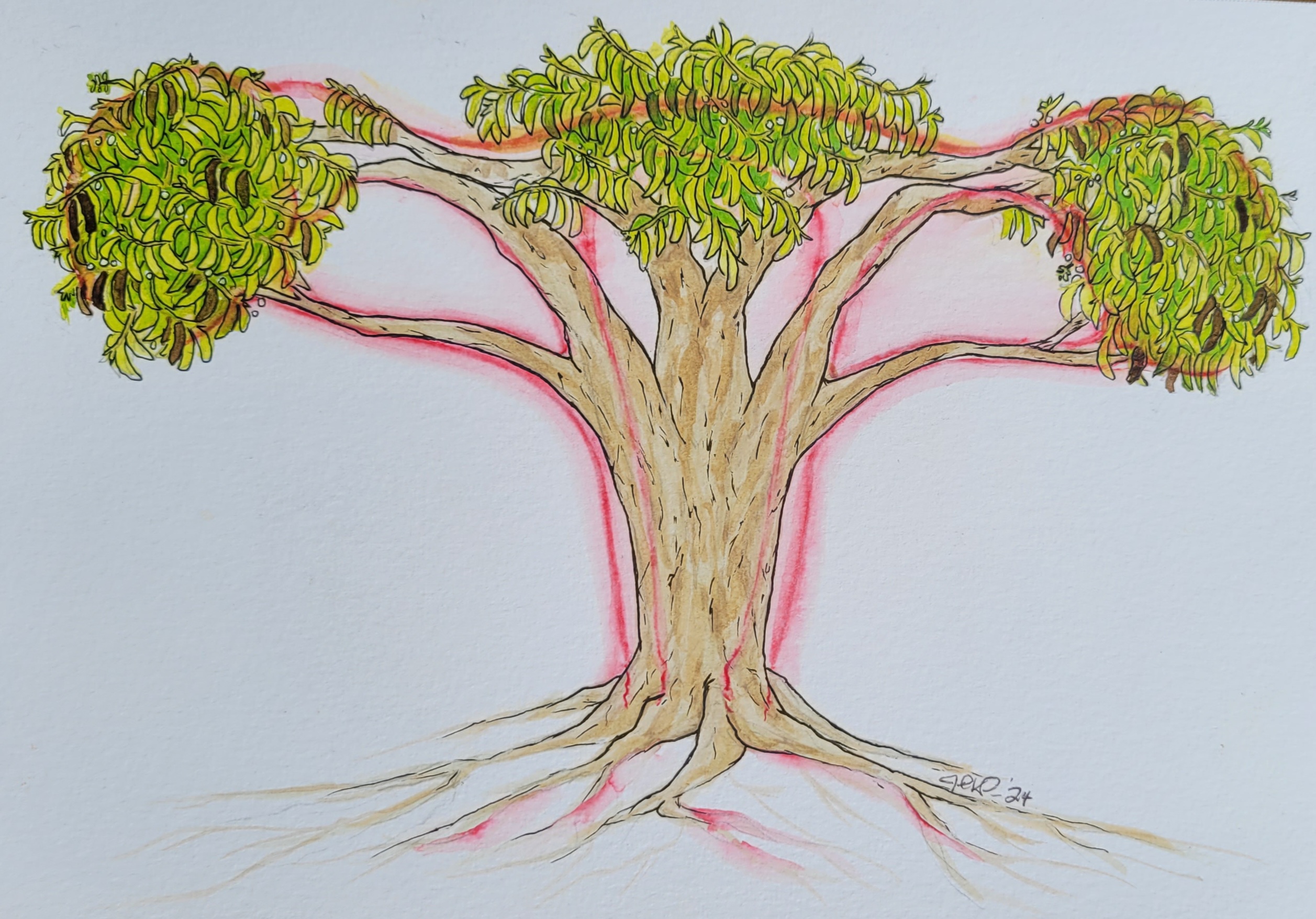 In this art piece I wanted to represent the strength of a woman. The tree bearing the name of Koa. What a woman is capable of, whether being a mother, a sister, a daughter, a friend. Brave, bold and full of courage against so many trials. I also wanted to represent the root Chakra, the safety and security of our womb. Through our womb life begins.
